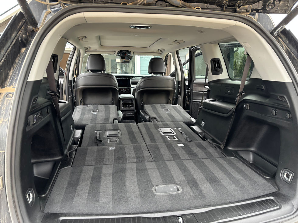 Experience the luxury of clean, detailed black leather seats in the car interior. The spacious cargo area and folded rear seats looking like it's fresh of the lot.